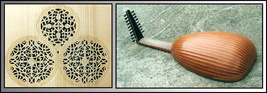 £4400 6-course / £4600 7-course This lute has a very beautiful and unique rose design (shown below and at the top of the homepage of this website) and a beautifully-proportioned and elegant back quite different in concept to its sister Hans Frei instruments KHM C33 & C34. Interestingly, like both C34 and C33, it exists today as a conversion to 11 courses. The instrument shown above strung with Nick Baldock's 'Kathedrale' gut strings has a back from figured maple of a very similar grain to that of the original; the rose is copied from that of the original lute, and we have reconstructed the probable neck length, the style of the neck and pegbox taken from surviving instruments and iconography. The fingerboard is from figured satinwood, edged with bone; the fingerboard extends onto the soundboard, as many 16th Century lute fingerboards seem to have done, as depicted in contemporary paintings. The fixed wooden body frets had not been fitted when the photographs were taken. Owned by Ron Andrico and Donna Stewart, of Spencer, New York, who emailed us after receiving it, in February 2006: "It's incredibly beautiful, like something that belongs in a museum, and it sounds just as good. We love it. It arrived in excellent condition thanks to your careful packing; the carton was barely even scratched. The lute is quite beautiful, the bookmatching of the bowl was done well, creating a wonderful shimmering effect that I can see from across the room this very minute. The rose is one of the best I've seen and I may have logged more time staring at the carving than I have playing the lute so far. More to the point, the lute sounds great. It is a little frightening to hear an instrument sound so well, fresh out of the shipping carton. I played through some of my favourite six-course music, which I have been neglecting for far too long, and had very little problem adjusting to the longer string length. Donna says the lute matches her voice, light and dark at the same time. We read through some early chansons we are preparing for an upcoming program and the polyphony is clear and transparent. Thanks for working with us to make an idea a reality". |