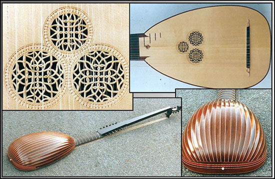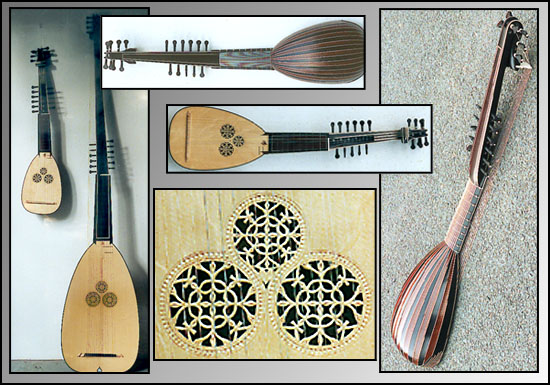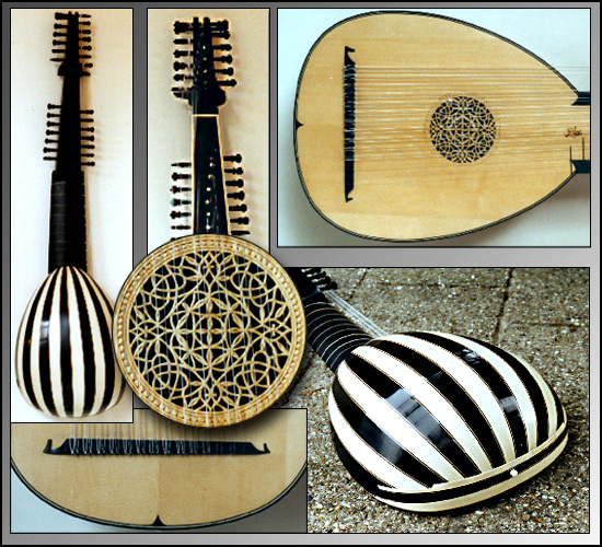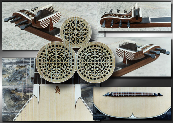 This instrument is based on a Buechenberg chitarrone, made using ebony for its 43 ribs (No. 11 below); the delicate but pronounced fluting of the ribs a stylistic and characteristic feature of large multi-ribbed backed lutes is clearly visible in the image above. The second composite image shows details of a version we built in 2004 of an original chitarrone made by Christoph Koch in Venice in 1650: This instrument's triple rosette is closely based upon the Koch original; the fingerboard points and curved triangular inlay in the lower soundboard are mammoth ivory edged with a fine ebony line, the sides of the upper neck are veneered with walnut, and the upper pegox itself is made of walnut. The chequerboard pattern on the front of the upper pegbox is made from snakewood and bone squares; soundboard half-edging white/black/white/black multiple binding; inlaid bone curved-sided triangle rising from lower soundboard binding; lower neck veneered with ebony with white inlaid stripes, upper neck veneered with ebony front and rear, with triple white/black/white edgings, and with walnut facings along the sides; upper pegbox face with snakewood/bone chequer design; ebony pegs with bone pips; triple rose; mammoth ivory fingerboard points outlined with an ebony line; bookmatched snakewood fingerboard central panel framed with ebony with inlaid white panel lines. The black-stained bridge is surmounted by an inlaid panel of snakewood edged with bone and ebony; the 15-rib back of this instrument ids made from ebony striped with ghostly-white holly staves. This is a 'fully decorated' version of this particular model – built in 2003 and kept at our workshop; the triple white/black/white edgings to the upper neck are here applied not only to the front which we usually offer as 'standard' but also to the rear of the upper neck, and sweep around the curves of the upper pegbox. The instrument has double stringing on the fingerboard and single diapasons (as the original has) with a 7x2 / 7x1 disposition, at 860mm stopped string length, tuned to a (at 415). All of the instruments on this page of the website can be ordered with varying levels of decoration, all of which is stylistically appropriate to the original and based upon our extensive research and documentation. Archlute, arciliuto The 'classic' archlute string lengths are 670mm stopped, and 1400mm diapasons (as found on the Harz instrument below) the stringing being 6 double courses on the fingerboard plus 8 single diapasons. This usually means that the player wants the instrument set up with the 14th course as a high f#. However, many modern players have chosen to have 7 courses on the fingerboard, with the 7th course single, thus becoming the first 'diapason', and allowing the high f# to be played on the fingerboard, thereby allowing a good, rich, low F as the 14th course. Please let us know your preferences when ordering. 1. Own design