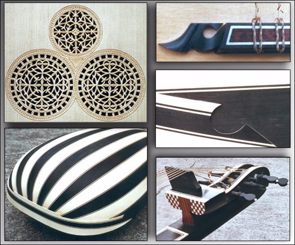 39 or 43 ribs in yew or rosewood; ebony-veneered upper neck; lower neck
