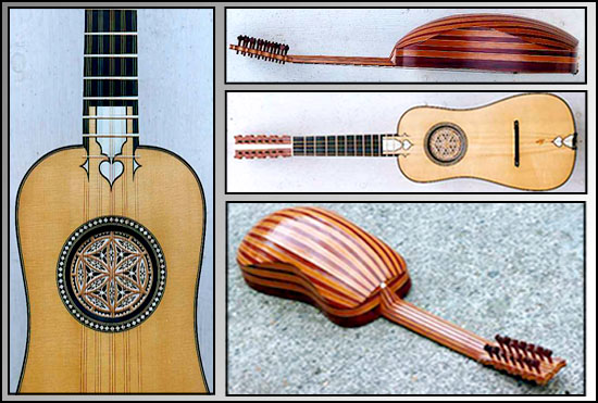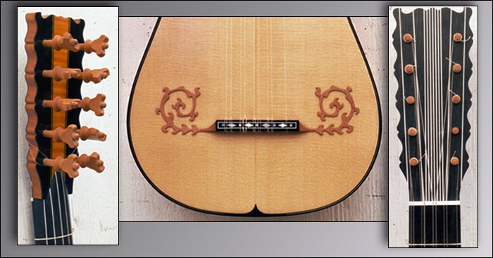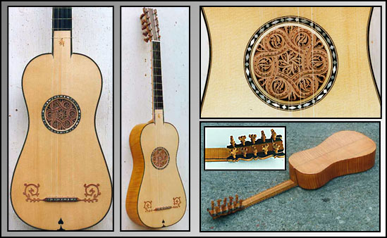 5x2 / 8x1 stringing is also available as an option) £6000 with rosewood ribs, £6600 with yew ribs We were able to closely examine the original Grammatica painting when it was included in the London Royal Academy of Arts 2001 exhibition The Genius Of Rome. This reinforced our long-standing feeling that the draughtsmanship of the two instruments depicted was very likely reliable, and had been painted using real examples as models. Working from iconography in this way is always challenging, and of course we couldn't resist a shot at such a famous painting (it is reproduced, inter alia, as the cover of a CD by Rolf Lislevand of Libro Quarto d'Intavolatura di Chitarrone / Johannes Hieronymus Kapsberger / Roma 1640 on Astrée Auvidus E8515, on which a chitarra battente by us can be heard { No.17 above}). There are certain problems with working from the painting - the rose is not circular, but slightly ovoid, and its details not entirely legible or symmetrical; the chiaroscuro style of the the work throws shadowing over the bridge end (which is otherwise visible) and obscures its exact design; the body shape is also asymmetrical, and the alignment of the necks and strings had to be adjusted to allow a playable string band. But there is a wealth of inspiring detail to refer to in this wonderful painting, and we hope that our version of the instrument has done justice to Grammatica's vision - it certainly works very well as a theorboed guitar, clear and powerful, and very familiar under the fingers of a guitarist. We have built this instrument on the body of the Matteo Sellas archlute (Bologna, Bardini Nr. 1748 - L.M.6 / No 5 on the continuo instruments page), since it appears to be very close to that instrument in outline. There are certain problems with transcribing information from the painting: the rose, for example, is painted not circular but slightly oval, and the body is asymmetrical in outline. The Sellas seems to us, however, to be reasonably near to the shape, style and probable size of the instrument depicted. Regretably, we do not have available here images of the first Chitarrone Francese that we built in 1998, since the player who ordered it asked, for reasons of his privacy, that images of it be kept off of the website. Early in 2004 we built another example for the English baroque guitar player Jim Bisgood and he is more than happy to have images of his example posted here (see above). It is very closely modelled on the Grammatica painting, including the decoration and rose design. Jim intends to use it as a theorboed guitar, as a complement to the Checchucci 5 course guitar we built for him in June 2003. Currently in preparation: 19. After Antonio Mariani, Pesaro 1680 (Leipzig, Musikinstrument Museum, No. 536; formerly collection of Musikwissenschaftl. Instrumentenmuseum der Univ. Leipzig)
