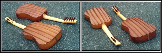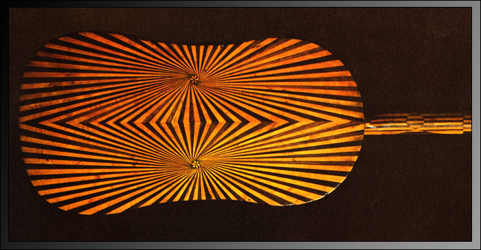 walnut) as the original instrument. This model is also available with a back constructed like the original, with over 200 pieces of alternating woods in a book-matched radiating design, in walnut/cypress, walnut/ebony or walnut/brazilwood (to complement the timber choices above). £4200 In the 2 images immediately above, the back on the left is constructed from cypress and walnut, the one on the right is from ebony and walnut. The fingerboard of the vihuela third from the left, top row, is made from a marquetry of walnut and boxwood, the design based on a painting by Juan de Juanes [1523-79] La Trinidad con querubines y ángeles in the Convento de Santa Clara, Gandia (Valencia). (with radiating 'sunray' design as above: £5000; inlaid fingerboard £500 extra) 2. Vihuela in a' (Own design, as above)