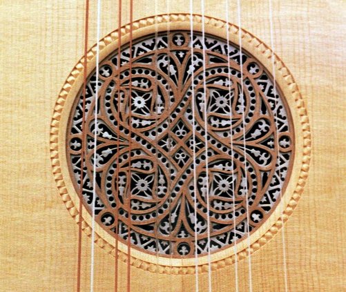 soundboard with beautiful rosette in 2 thin layers of cypress with parchment