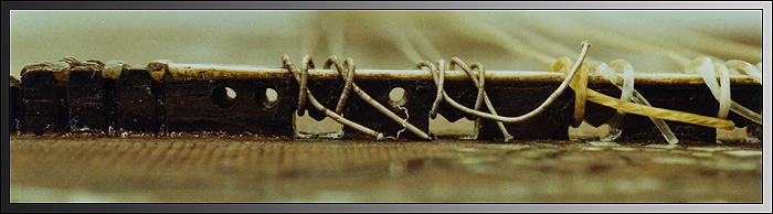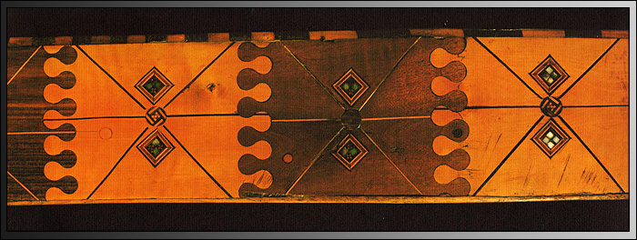 The 'Chambure' vihuela in the Cité de la Musique (E.0748) This instrument was first drawn to public attention by Joël Dugot, in 1998. It had lain forgotten and effectively mis-catalogued in the depot of the old Paris Conservatoire collection, having been bequethed by the late Geneviève Thibault, Comtesse de Chambure. Perhaps one of the most important organological discoveries for decades, this instrument presents the clear impression of having been originally constructed with a serious player in mind, rather than a rich dilettante. It is made from local materials native to the Iberian peninsula: it has a cypress neck, and back and sides from jujube a fruitwood rather than exotic, expensive imported materials. Its soundboard is unadorned except for a beautiful inset rose, made of wood backed with parchment. In September 2010, we delivered a copy of this instrument to the Cité de la Musique, which was commissioned from us by them, so that they would have a playable example. The copy was made using the same timbers as the original, and its first public showing was at a conference in the Musée on November 27th 2010. The lower 2 images (above) show the inside of the back of the original on the left, with, to its right, the inside of the back of our first copy; the little diagonal strips across the ribs are parchment, as are the corner strips between the side and back ribs. The slender spruce bottom block and the one-piece neck & slipper block are clearly visible in both instruments; the carving and shaping of the original's slipper block are so similar to that of the Dias guitar, that we are sure they are at the very least from the same workshop, if not the same hand. The two images above show the original instrument's rosette (the missing section to the right in each view helps to orientate the viewpoint - the soundboard was rotated through 180û between the two photographs). Its structure - two layers of wood backed by one layer of parchment on the inner surface - is clearly visible; the parchment layer carries cut and punched filigree detailing. The outer, upper surfaces are covered in a thin layer of paint or possibly gesso (was the original intention to gild it ?) whilst the inside view shows the parchment curling away from the timber in places, with the undulating distortion of the rosette due to the effects of age and fluctuating humidity unmistakable. The rosette of the 'Chambure' vihuela (left) has certain similarities with the rosette of an anonymous guitar in the Vienna KHM collection; the basic elements of the pattern are apparent in both designs, the vihuela's rosette being generated on a multiple of three, whereas the guitar's is based upon a multiple of four. The guitar rosette is made from two layers of wood, the vihuela's from two layers of wood with a bottom layer of parchment. It is interesting to speculate on the origins of the two designs (and indeed the rosettes themselves) given what we now know of the trade in pre-made rosettes and entire soundboards between the early instrument makers across Europe. The guitar rosette was probably made several decades after the vihuela's. The Quito vihuela The third example is claimed to be a relic of Saint Mariana de Jesús (1618-1645); there is apparently continuous documentation to support this attribution. The instrument is kept in the Iglesia de la Compañiz de Jesús de Quito, and because of the hitherto near-impossibility of its availability for close study by scholars and organologists and its extremely fragile condition, it had not been comprehensively examined. Donald Gill published a monograph on the instrument entitled A Vihuela in Ecuador in the Lute Society Journal in 1978; this article was illustrated with black line drawings (but no photographs) by Oscar Ohlsen. Confusingly, Oscar draws what look like holes in one view of the bridge, and cut-outs/slots in the other, with no accompanying explanation. Diana Poulton had earlier published an article also entitled A Vihuela in Ecuador in the LSJ in 1976. Nothing further was published concerning the instrument until 1991, when Egberto Bermudez contributed an article to the catalogue of the 1991-92 exhibition La Guitarra Española; this included but one tantalising colour photograph, a slightly oblique view of the front of the instrument (reproduced twice, on pages 24 and 32 of the catalogue, at different scales). Interestingly, Egberto erroneously states that the Quito instrument's bridge has holes for the strings; he seems to have failed to observe the rectangular cut-outs with which it is actually fitted (perhaps he had been expecting to find drilled holes, or didn't have time to look more closely?). He did, however, correctly observe that the instrument's neck and pegbox (and heel & block) were carved from one piece of wood a fact subsequently confirmed by Ariel Abramovich in 2005. Thankfully, our good friend Ariel a vihuela specialist was able to take some new photographs of the instrument over the summer of 2005, which have revealed some very interesting features. For example, the bridge has 'window' cut-outs for each course of strings, cut in a 'letter-M' shape very similar to the bridge of the Cassas Baña guitar in the Brussels MIM collection (this instrument being a 5-course guitar probably made later in the 17th Century). The influence of Iberian guitar design is apparent, with stylistic pointers to the later Cadiz school in the handling and design of the inlaid decoration. Above: an oblique view of the bridge of the Quito vihuela, the image kindly supplied by our friend Ariel Abramovich. The M-shaped cut-outs/slots to hold and guide the strings are clearly visible, as are what appear to be indentations from the first two courses of strings (perhaps indicating that metal strings were fitted at some point?). Above: a close-up of the bridge of the Cassas Baña 5-course guitar, probably built contemporaneously with the Quito instrument, or later; the same M-shape