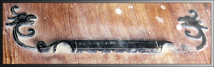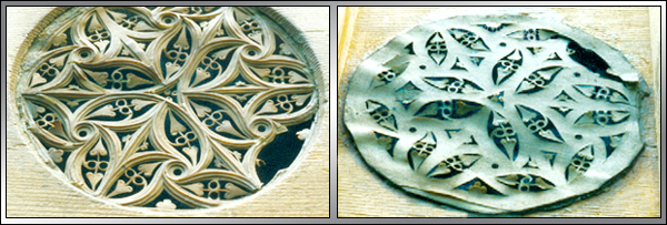 2 thin layers of cypress with parchment trefoil decoration behind; narrow