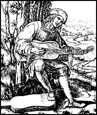 decoration behind); narrow bridge with bone finial ends. This low-pitched instrument like No. 3 above is useful as an accompaniment instrument for Vihuelista pieces. We also offer this instrument with either a composite, set-in rosette, similar to the Chambure instrument below, or with one which is carved into the wood of the belly, like a lute; we took our cue from the Seville Ordenanzas of 1527, as well as contemporary Ordenanzas from Granada and Mexico City, which allow rosettes to be either carved or assembled and set-in: incomes or encomes. There is some doubt as to exactly what encomes means, but it is generally accepted that encomes very strongly suggests engomes, probably meaning glued - thereby implying a rosette assembled from wood & parchment. 8. Discante in c" (Own design, following Juan Bermudo's Declaración de Instrumentos Musicales, 1555)