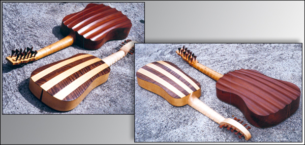 trefoil decoration behind; narrow black-stained bridge. The composite image below shows our prototype copy; this instrument has been strung with Nicholas Baldock's Kathedrale gut strings since March 2002; in December 2002, it travelled to Mexico City and back, remaining in tune and up to pitch throughout. The structure of its body is absolutely stable and strong, and having made several very successful versions of this instrument now, we are convinced that the strength and lightness inherent in this construction was what inspired the original concept. We finished this close copy indeed the first proper modern copy of this instrument in May 2001, having measured and photographed it in Paris when it was open in April 1999. It has Cuban mahogany back and sides, cypress one-piece neck and peg box, a wood and parchment rosette, and a 646mm string length. We were the first modern makers to arrive via our own efforts and initiative, and working independently at a proper, reliable and consistent solution to the tantalising challenge represented by its unique double-bent rib back construction. 7. Vihuela in e' (own design; based on Paris, Cité de la Musique No. 259)