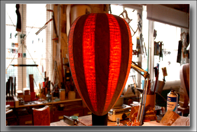 The image above was taken in our workshop, and shows a seven-course lute with a nine-rib back, which is made from four slices of Hungarian ash, sawn in sequence and bookmatched, striped with five ribs of a different cut of Hungarian ash from a different tree. In order to produce the curious light effect seen here, a strong light has been shone into the bowl of the lute, illuminating the ribs from within the lute's body (before the soundboard was glued in place). We think that the different way in which the light penetrates the two timbers something which would not ordinarily be observed and in this case only made possible because the soundboard had not been fitted when the photo was taken makes for a very interesting and unusual aspect of a lute, a striking image, and something that a player is not likely to encounter.