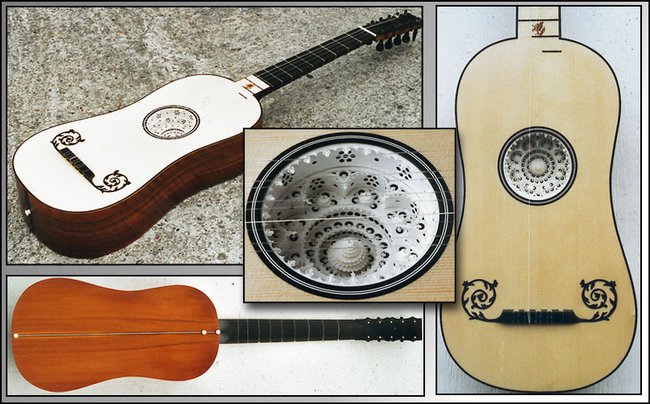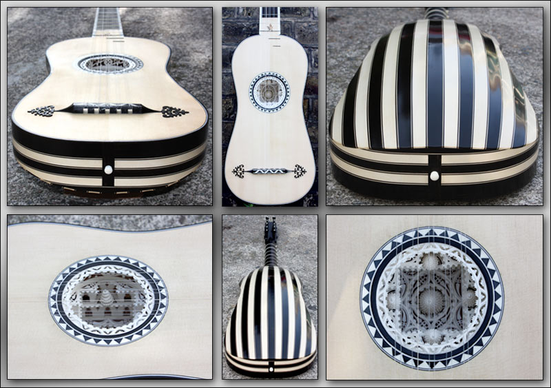 Baroque Guitar after Martin Kaiser, Venice 1699 (No.8 in the Renaissance and Baroque guitars section) Marbled ebony sides and walnut back inlaid with holly; parchment rosette in 3 tiers; mother-of-pearl decoration around soundhole and atop bridge. 710mm string length. Owned by a player in Bruges, Belgium.