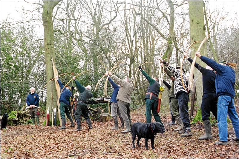 Above: the archers of the Medieval Society shooting a tribute at the scattering of Tony's ashes on December 30th, 2007, in the woods in Kent where as a founder member of the Medieval Society he used to regularly take part in archery practice and other events.